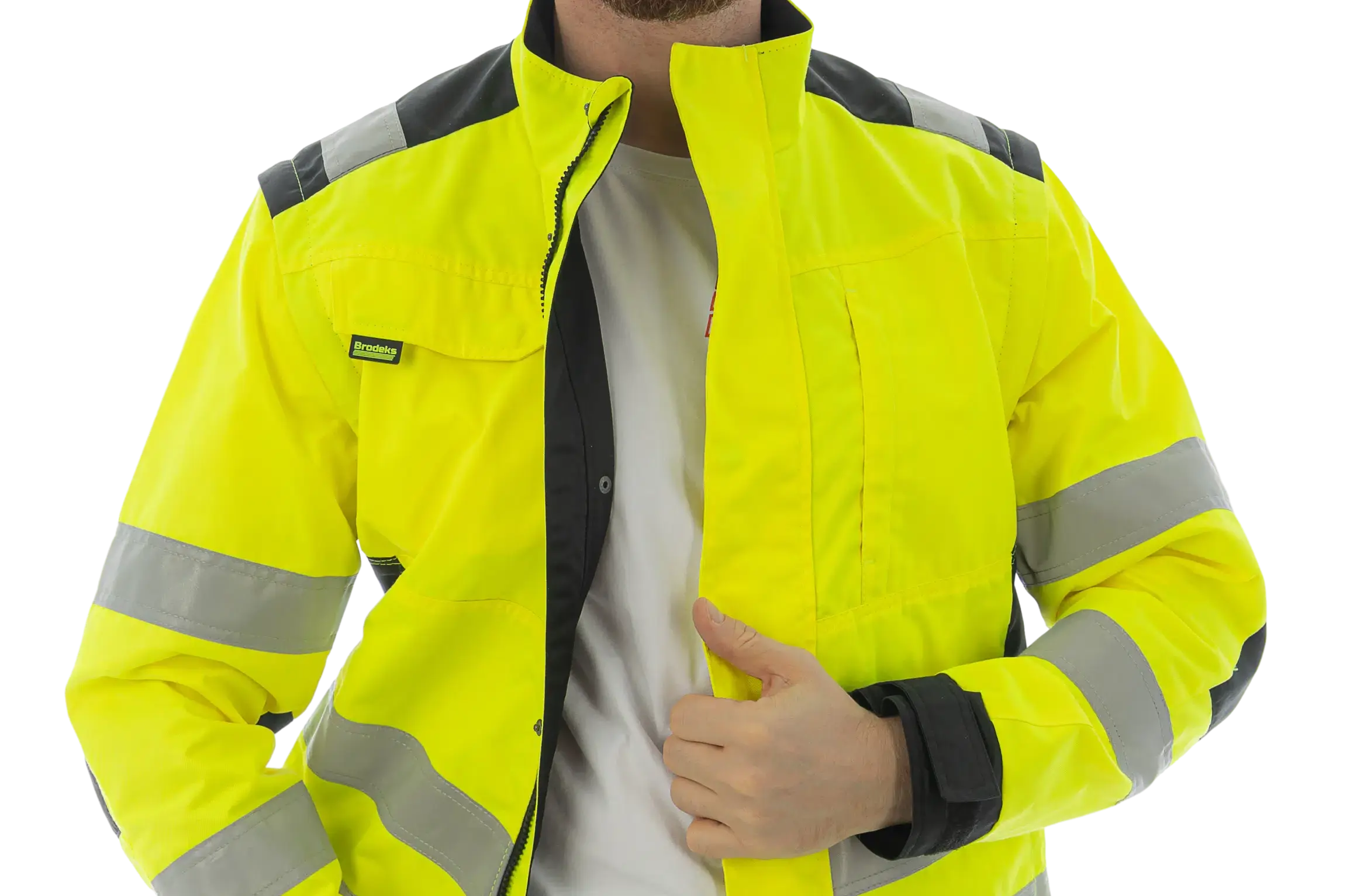 Куртка Brodeks KS 225 отвечает требованиям 2 класса видимости и может использоваться как жилет благодаря отстёгивающимся рукавам. Эргономичный крой обеспечивает удобную посадку и свободу движений, удлинённая спинка и воротник-стойка придают изделию аккуратный внешний вид. Центральная молния с планкой, сетчатая подкладка, карманы на молниях и петля с карабином для бейджа делают куртку практичной и функциональной для работы в любое время года.
